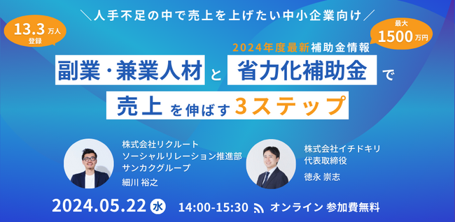 株式会社イチドキリ(本社:東京都渋谷区、代表取締役:徳永崇志、以下「イチドキリ」)は、副業・兼業人材のマッチングサービスである「サンカク」を提供する株式会社リクルートの事業担当者をお招きし、中小企業向けに「副業・兼業人材」と「中小企業省力化投資補助金」を活用して売上を伸ばす3ステップについて解説するオンラインセミナーを2024 年 5 月 22 日(水)に開催します。