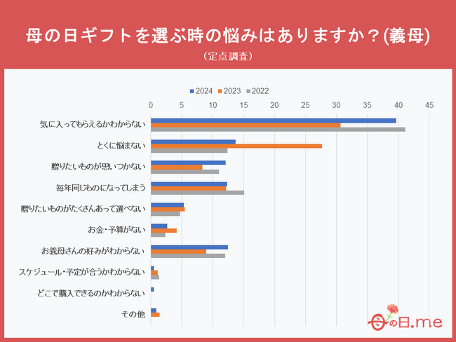 母の日のプレゼントで一番の悩みは、気に入ってもらえるかわからない?「母の日ギフトを選ぶ時の悩みはありますか?」の調査アンケートで、実母や義母への母の日プレゼントでの悩みや不安に関する実態調査を実施。