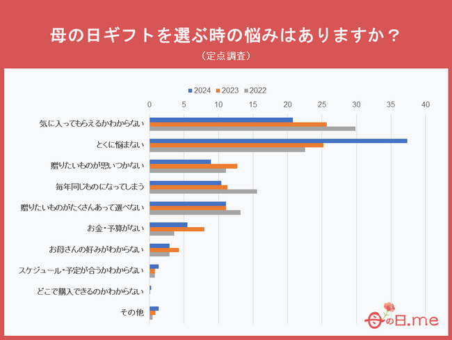 過去2年間の定点調査によると、2024年に「とくに悩まない」と回答した人が37.4%となり、過去のどの年よりも多い割合となりました。「気に入ってもらえるかわからない」や「贈りたいものが思いつかない」が2024年では過去の年よりも減少している事が分かりました。これらは、過去数年の間がコロナ禍であった事から、離れて暮らすお母さんとコミュニケーションが不足していた期間であった事が要因だったと考えられます。コロナが明け、親子のコミュニケーションが増えた事で今年は例年よりもプレゼント選びで悩む人の割合は少なくなったという結果となり、今年は多くの人が悩みはなく、母の日のプレゼントを選べている事が分かりました。