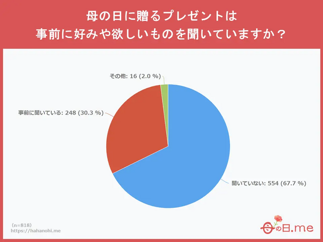贈るプレゼントは、事前に相手の好みや欲しいものを聞いていますか?というアンケート調査(n=818)では、「聞いていない」が67.7%、「事前に聞いている」が30.3%でした。前述の「母の日ギフトを選ぶ時の悩みはありますか?」という質問に対し、一番多かった悩みの回答が「気に入ってもらえるかわからない」という回答であった事を考慮すると、母の日のプレゼントにはサプライズ性を含めて当人から聞き出すという事はなるべくせずに、当日にプレゼントを渡して驚かせ、喜ばせたいという心象が含まれていると予想されます。