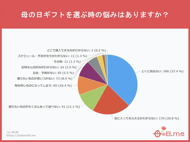 母の日.meが行ったギフトを選ぶ時の悩みに関するアンケート調査(n=818)では、一番多かった悩みは「気に入ってもらえるかわからない」と答えた人が多く、20.8%の割合の人が悩んでいるという事が分かりました。また、次に多かった悩みは「贈りたいものがたくさんあって選べない」で11.1%となりました。お母さんとのコミュニケーション不足や、母の日のギフト市場において小売店の競争が激化し、プレゼント商品の多様化が加速しており、選択肢が増えすぎた結果、悩みとなってしまっていると推測できる結果となりました。