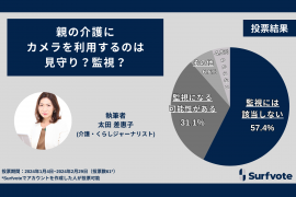 親の介護にカメラを利用するのは見守りか監視か? Surfvoteの投票では57.4%が「見守り」として肯定する一方、31.1%は親子の関係性によっては「監視になる」として心配する声が寄せられました。