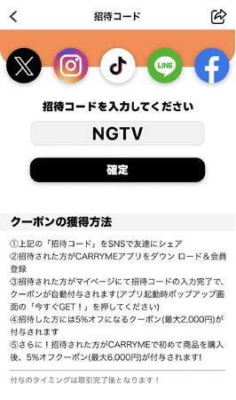 招待コード新規登録後、マイページ→友達招待ページにてコード「NGTV」入力で2,000円クーポンプレゼント!!