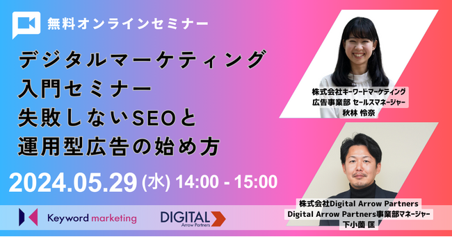 株式会社ベクトル(本社:東京都港区、代表取締役会長兼社長:西江 肇司、東証プライム:6058)の子会社である株式会社キーワードマーケティング(本社:東京都港区、代表取締役会長:滝井 秀典)は、株式会社TWOSTONE&Sonsの100%子会社である株式会社Digital Arrow Partners(本社:東京都渋谷区、代表取締役CEO:道家 康貴、以下 Digital Arrow Partners)と共同で、『デジタルマーケティング入門セミナー 失敗しないSEOと運用型広告の始め方』を5月29日(水)14時よりオンラインにて開催いたします。