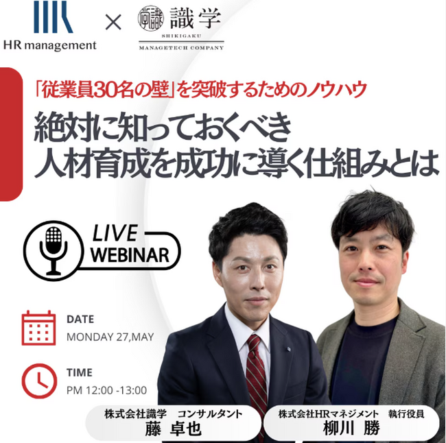 株式会社HRマネジメント(東京都豊島区、代表取締役:高橋 絵里香)は、株式会社識学(東京都品川区、代表取締役:安藤 広大)と無料オンラインセミナーを5月27日(月)12:00より開催致します。オンライン開催で参加費無料、当日の参加も可能です。