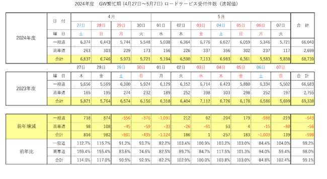 期間中、全国で受け付けたロードサービス件数は6万8,739件で、前年同期間の件数と比較すると599件減少しました。最も件数が多かったのは5月3日(金)の7,113件でした。