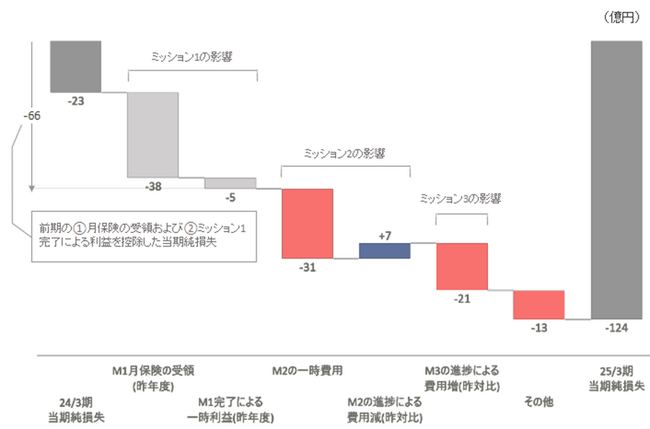 今期は約124億円の大幅な当期純損失を見込んでおりますが、計画通りの水準となります。昨年度は、ミッション1に関する月保険金の受領および、ミッション1完了による一時利益の効果が影響している一方、今年度はミッション2およびミッション3の進捗による昨年度対比での費用増が発生する見込みです。