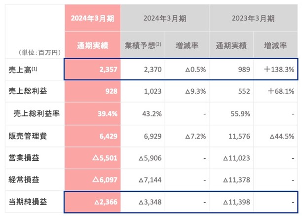 2024年3月期通期の売上高は、概ね2024/2/13に発表した通期連結業績予想通りに着地し、ミッション1の完了に伴う一時的な売上増がQ1に計上された他、Q2-Q4は主にミッション3の売上が寄与しました。