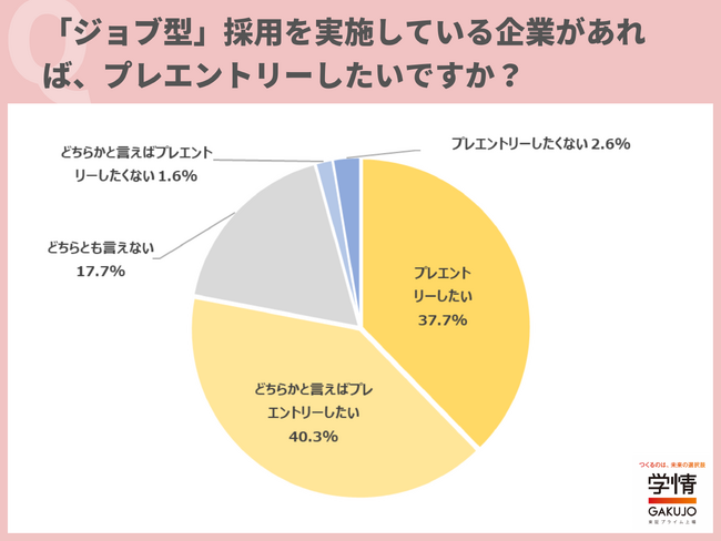 株式会社学情(本社:東京都中央区)は、2026年3月卒業(修了)予定の大学生・大学院生を対象に、インターネットアンケートを実施。今回は、「ジョブ型」について調査しました。「ジョブ型」採用を実施している企業に、「プレエントリーしたい」と回答した学生が8割に迫りました。「仕事内容をイメージしやすい」「キャリアプランを立てやすい」などの声が上がっています。「ジョブ型」採用を活用するための準備について、「準備している」と回答した学生は7.6%、「これから準備したいと思っている」の回答は46.6%でした。「希望する職種での就職に有利になるように、資格取得を目指している」「インターンシップに参加し、希望している仕事の適性があるかを確かめたい」といった声が上がりました。