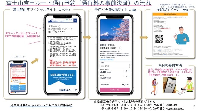 希望者は、「富士登山オフィシャルサイト」(https://www.fujisan-climb.jp/)から「山梨県富士山吉田ルート通行予約システム」にアクセスして、予約・通行料支払い(1人2000円=クレジットカードかQR決済)をします。手続きが終わると、QRコードが付いた「完了メール」が届きます。登山当日は五合目の受付で端末にQRコードをかざし、配布されるリストバンドを着用することで通行できます。