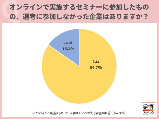 オンラインで実施するセミナーに参加したものの、選考に参加しなかった企業があると回答した学生が84.7%に上りました。8割以上の学生が、オンラインのセミナーに参加後、選考に進まなかった経験があることが分かります。