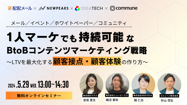 ファクトに基づいたコンテンツ開発とマーケティング支援を行う、株式会社IDEATECH(本社:東京都港区、代表取締役社長:石川友夫)は、株式会社ラクス(本社:東京都渋谷区、代表取締役 中村崇則)、コミューン株式会社(本社:東京都品川区、代表取締役CEO 高田優哉)、株式会社ニューピークス(本社:東京都渋谷区、代表取締役 小林 慶嗣)と共同で、2024年5月29日(水)13:00~14:30に「1人マーケでも持続可能なBtoBコンテンツマーケティング戦略~LTVを最大化する顧客体験・顧客接点の作り方~」と題するオンラインセミナーを開催いたしますので、お知らせいたします。