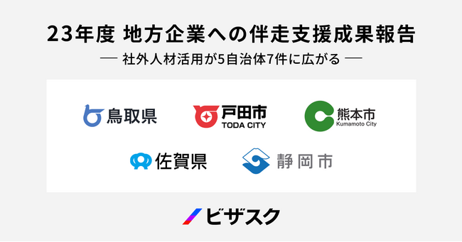 日本最大級(※)のナレッジプラットフォームを運営する株式会社ビザスク(以下、当社)は、2021年度の鳥取県DX伴走支援事業への取り組みを皮切りに自治体とタッグを組んだ地域企業への支援に注力してまいりました。以降、年々案件の数や活用の幅は広がり、2023年度は5自治体7件と、多くの地域中小・スタートアップ企業に対して、社外人材による伴走支援を提供いたしました。この度、2023年度の全件の支援が終了いたしましたので、自治体連携事業の成果をまとめて発表いたします。
