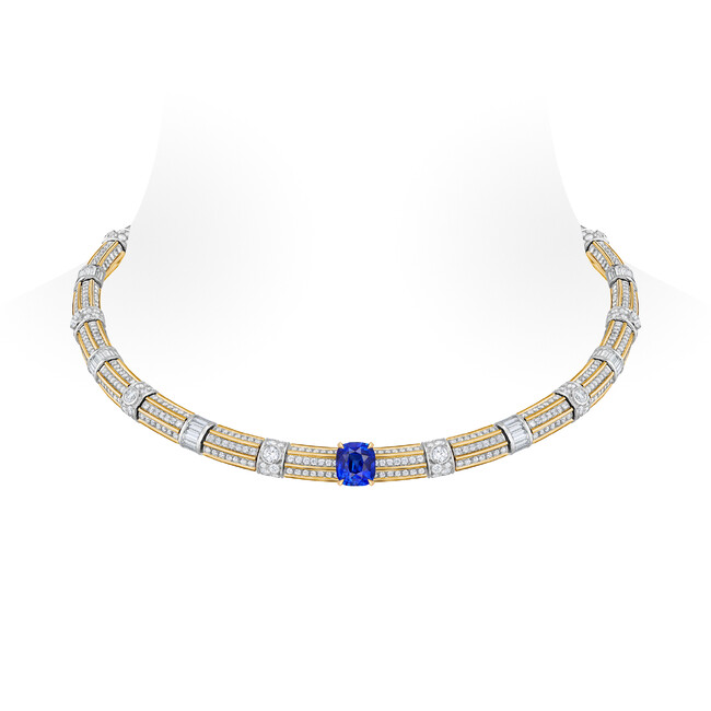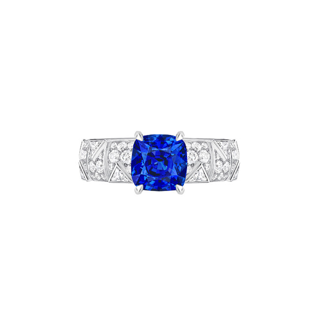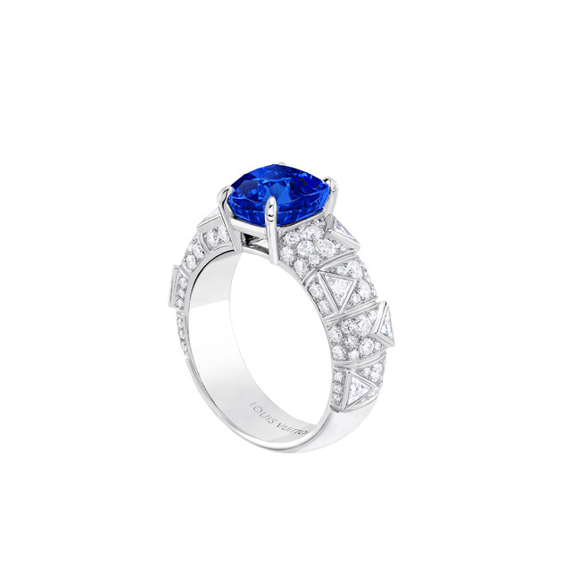 また、ルイ・ヴィトンのハイジュエリー コレクション「Deep Time(ディープ タイム)」より、プラチナ、ホワイトゴールド、サファイア、ダイヤモンドの「Fossil(フォッシル)」ネックレス、「Spirit(スピリット)」より、ホワイトゴールド、サファイア、ダイヤモンドの「Liberty(リバティ)」リングを合わせました。
