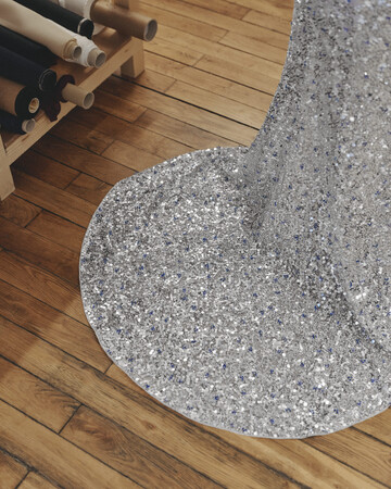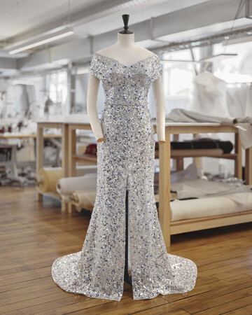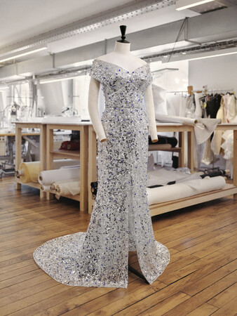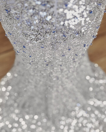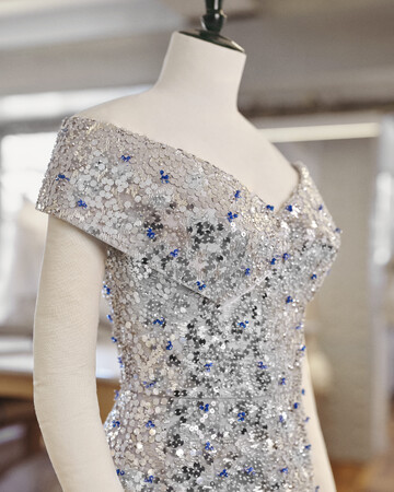 幾何学模様のデコルテが特徴的なこのチュールビスチェドレスは、シルバーのスパンコールとブルーのクリスタルビーズで刺繍され、制作に約350時間、さらに手刺繍に約1500時間をかけて完成しています。