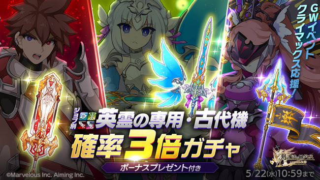 株式会社マーベラス(代表取締役社長:佐藤 澄宣/所在地:東京都品川区)は、スマートフォン向け本格オンラインRPG『剣と魔法のログレス いにしえの女神』において、2024/5/15(水)に「ジョブ別 英霊の専用・古代機確率3倍ガチャ」の販売、および「シークレットガーデン~奪われた体と忘れられた人形~」のクエスト追加を含むアップデートを行ったことをお知らせいたします。