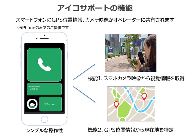 スマートフォンの映像を通じて、専門のオペレーターが視覚情報を提供するサービスです。タイムリーに視覚情報を提供することにより、生活面での利便性を高め、視覚に障がいのある方がいつでも気軽に安心して行動できることを目指しています。位置情報と映像を遠隔地にいるオペレーターが確認してご案内します。安心してご利用いただくため、コンタクトセンターは厳格な個人情報管理のもとで運営され、専門の研修を受けたオペレーターが対応します。