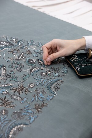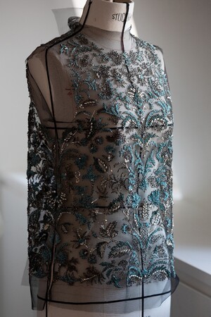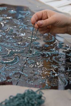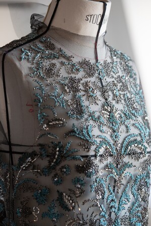 チャオ・タオは、2024年春夏 オートクチュール コレクションのルック#35からイブニング アンサンブルを纏いました。刺繍がほどこされたチュールブラウスとドレープスカートには、メタリック糸で表現されたオットマンガーデンと、ヘマタイトのトリミングとブレード、ビーズとシャトルがハーモニーを作り出し、玉虫色の泡と青磁色のモアレに、ターキンブルーのシェニールがアクセントを加えています。このルックの制作にはスカートの刺繍に1000時間、アトリエでの作業に350時間が費やされ、ブラウスの刺繍には800時間と、アトリエでの作業に250時間が費やされました。刺繍はアトリエ ルサージュで行われています。