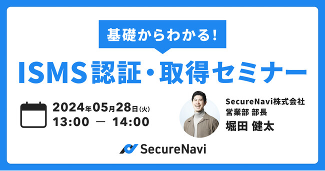 ISMS・Pマークオートメーションツール「SecureNavi」を提供するSecureNavi株式会社(本社:東京都中央区、代表取締役CEO:井崎友博 以下、当社)は、2024年5月28日(火)13:00-14:00に「基礎からわかる!ISMS認証・取得セミナー」を開催します。