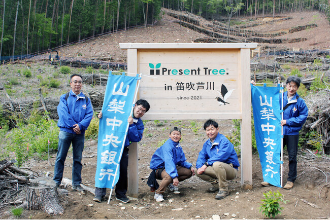 株式会社山梨中央銀行(頭取 古屋 賀章)は、株主総会における株主さまの議決権行使について、インターネットでの行使により削減される郵送代相当額等を、地域の植樹活動を行う認定NPO法人環境リレーションズ研究所が運営する「Present Tree」(※)に寄付することとし、昨年開催された第120期定時株主総会分について、以下の通り寄付およびこれに基づく植樹を実施いたしました。