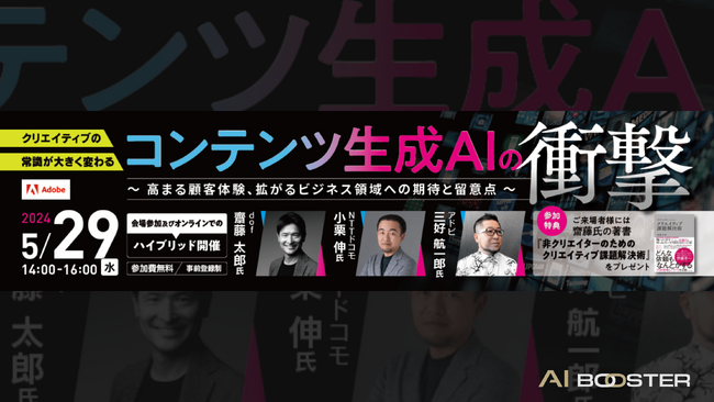 「コンテンツ生成AIの衝撃 ~高まる創作の可能性、拡がるビジネス領域への期待と留意点~」は、株式会社文藝春秋が主催する生成AI関連のイベントです。実際にクリエイティブ現場で起きている変化や、非クリエイターによるコンテンツ制作の取り組み事例などを踏まえながら、コンテンツ生成AIの最新動向について、AI Booster CEOの小栗伸、株式会社dof 代表取締役の齋藤 太郎氏、アドビ株式会社 デジタルメディア事業統括本部 Senior Strategic Business Developmentの三好 航一郎氏の3名が講演いたします。