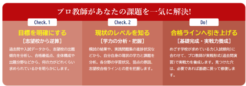 プロ教師による指導は全て、夢の第一志望校合格から逆算した「個人別カリキュラム」に基づいて行われます。本当に入りたい“夢の第一志望校”に合格するために、「いつまでに・何を・どのレベル」まで完成させる必要があるのか。