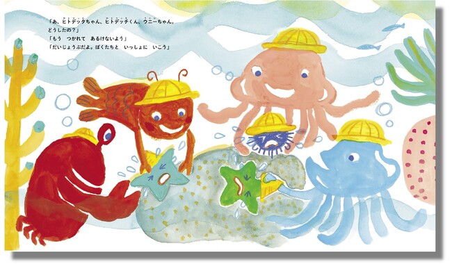 大ヒットソング「エビカニクス」の生みの親で音楽ユニットのケロポンズが、今回の絵本のためにオリジナルストーリーを書き下ろしました。他にもクラゲやヒトデなど様々なキャラクターが登場。独特の色使いが愛らしい水彩画で描かれた絵は、絵本作家・市居みかさんによるものです。