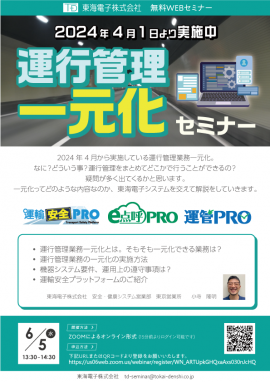 アルコール検知システム、 IT点呼システム、 運行管理システムを開発・販売する東海電子株式会社(本社:静岡県富士市 代表取締役 杉本 哲也)は、 この度、運送事業者様向けに「運行管理一元化セミナー」を6月5日(水) に無料開催いたします。