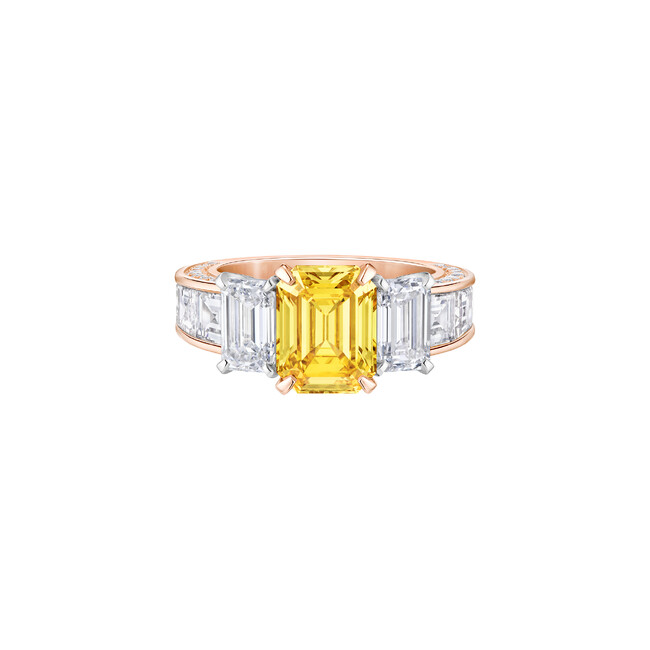 またメゾンのハイジュエリー コレクション「Deep Time(ディープ タイム)」より、ピンクゴールドとプラチナ、3.02カラットのエメラルドカットのイエローダイヤモンドとダイヤモンドが煌めく「Laurasia(ローラシア)」のリングを着用しました。