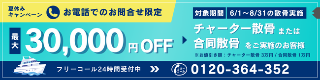 特 典:チャーター散骨プランから3万円割引/合同散骨プランから1万円割引