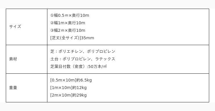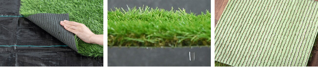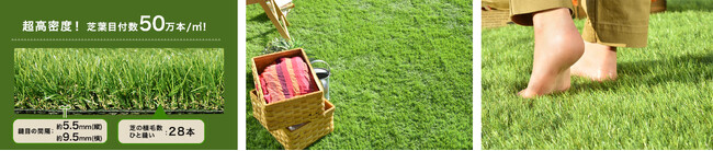 本製品は芝葉目付数が50万本/平方メートル で高密度となっており、見た目はもちろんふさふさとした触り心地で芝の自然な風合いを再現しています。さらに毛足は35mmとなっており、裸足で歩いた場合にもクッション性が高くなるので心地がよく、より自然な芝生に近い感覚でご使用いただけます。