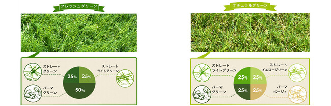 さらにフレッシュグリーンとナチュラルグリーンの両方につや消し加工を施すことによって、天然芝のような自然な風合いを再現しています。