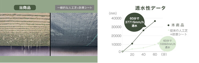 またこの製品は、防草シート機能と一体型となることで人工芝の敷設において大きな手間であった防草シートを事前に設置する下準備の手間を削減でき、これまでの人工芝で課題とされていた「水はけの悪さ」や「設置の手間」を大幅に改善する商品となっております。