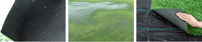 本製品は既存の人工芝にある排水穴をなくし、裏面全体に小さな穴をあけて生地自体が水を通す高透水基布を使用しています。これによって排水穴が詰まる懼れもなく、雨が降った後でもスムーズに排水が行われるのでカビやニオイ対策にもなります。
