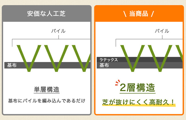 本製品はパイルが編み込まれた基布にラテックスというゴム製の層を固めた2層構造となっているため基布にパイルが編み込まれただけの人工芝に比べて抜けにくいです。