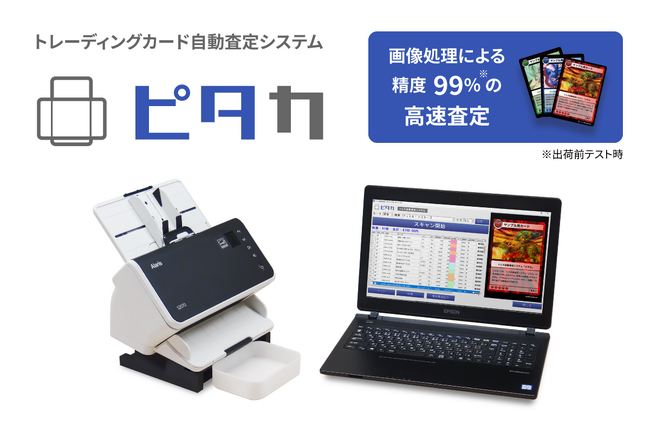 トレカビジネスを強力に支援することを目的とした、自動査定システムです。スキャナで読み込んだトレーディングカードを画像処理により判別し、インターネット上に構築した価格データベースから買取価格を取得します。価格データベースは週2回の頻度で最新価格に更新されます。「ピタカ」はカード100枚を3分45秒で読み取ることができ、99%以上の精度(出荷前テスト時)で判別可能です。「ピタカ」の導入により、簡単に素早く正確な買取作業が行えるようになります。