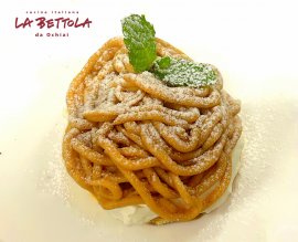 “本物のイタリア料理”を堪能できるお店として東京・銀座で25年以上にわたって人気を博す名店「LA BETTOLA da Ochiai(ラ・ベットラ・ダ・オチアイ)」からは「ズワイガニ入り カラスミの冷製カペッリーニ」と特製ドルチェ「モンテビアンコ」&「プリン」。