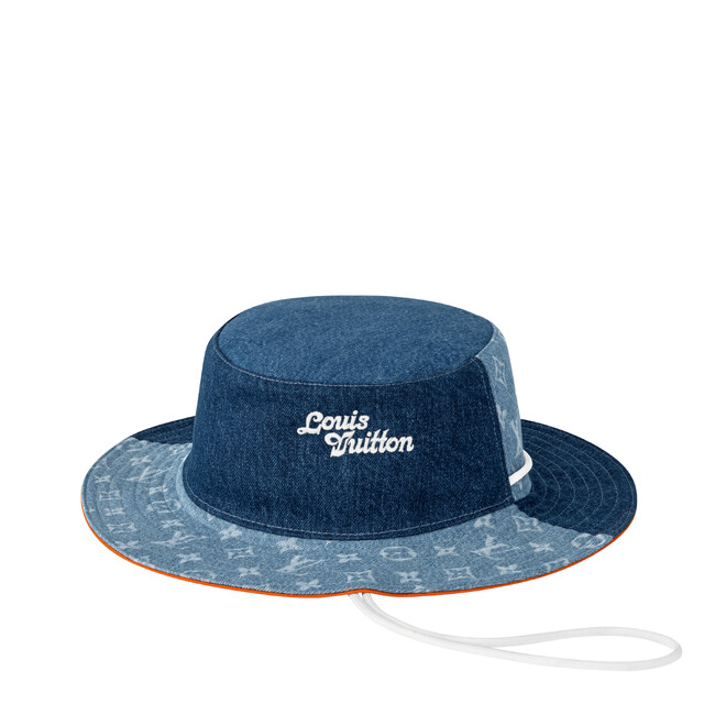 夏の雰囲気をクールに演出する「バケットハット・デニムパッチワーク エクスプローラー リバーシブル」は、モノグラムで飾ったパネルを備えたブルーデニムのパッチワークで仕上げ、「Louis Vuitton」の刺繍をコントラストカラーで施しました。裏面には鮮やかなオレンジのキャンバス地に、パームツリーをあしらった「Louis Vuitton」のパッチが彩りを添えます。アジャスターコードがスタイルを完成させる、多用途に楽しめるアクセサリーです。