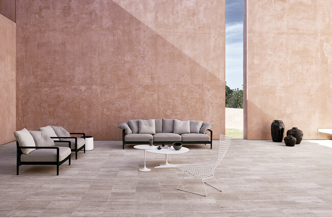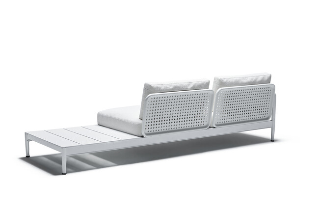 特筆すべきは、リチャード・シュルツによるデザインの名作「1966コレクション」にみられるコンテンポラリーなデザインとモダニズムのスタイルを継承していること。一連のシュルツのコレクションはリッソーニにインスピレーションを与え、現代的に再解釈したものが「リッソーニ・アウトドアコレクション」です。その直線的なフォルムが特徴で、背もたれに施されたマイクロパンチングパターンが目を引き、現代的な美しさを際立たせます。座面と背もたれのクッションカバーは取り外し可能で、屋外での長時間の使用に適しています。この新しいアウトドアコレクションに合わせ、ノルから新しいアウトドアファブリック「オアシス」も発表されました。
