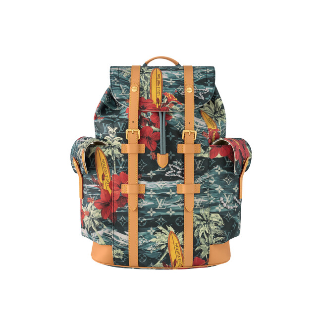 「クリストファー MM」は、キャンバスに施されたプリントはサーフボードや花々など精緻なモチーフと何層にも重ね、カラフルでヴィンテージな雰囲気を演出しました。外側に配した2つのサイドポケットなど複数のコンパートメントを備え、ボディフレンドリーなデザインと優れた収納性が魅力のバックパックです。