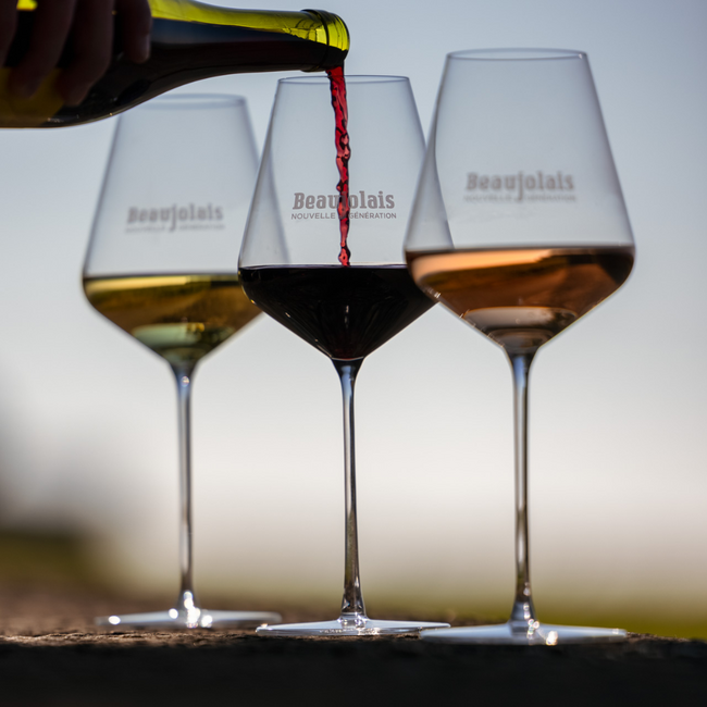 リヨンとブルゴーニュの南の間に位置するボジョレーのぶどう畑は、14,500ヘクタールに12のボジョレー・アペラシオンを有し、2,000以上のドメーヌ、9つの協同組合醸造所、200以上のネゴシアンが存在します。ボジョレーの12のアペラシオンは、パーティーのワイン、個性豊かなワイン、特別なワインなど、その表現に特徴があります。北部のブルイィ(Brouilly)、シェナ(Chenas)、シルーブル(Chiroubles)、コート・ド・ブルイィ(Côte de Brouilly)、フルーリー(Fleurie)、ジュリエナ(Julienas)、モルゴン(Morgon)、ムーラン・ナ・ヴァン(Moulin-a-Vent)、レニエ(Regnie)、サン・タムール(Saint-Amour)は100%赤のクリュです。南部のボジョレーとボジョレー・ヴィラージュは、赤・白・ロゼすべてとボジョレー・ヌーヴォーを造っています。