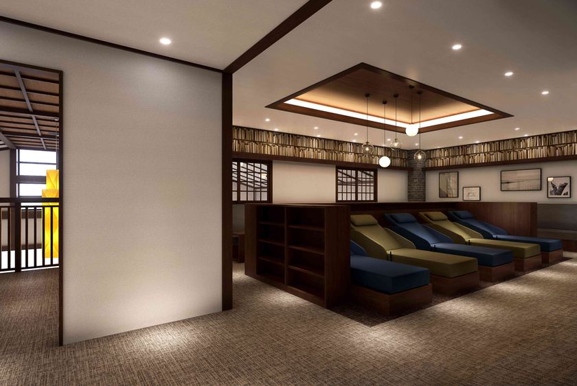2Fゆったりラウンジ右手にはリクライニング&フラットスペースの部屋とマッサージルームを設置。