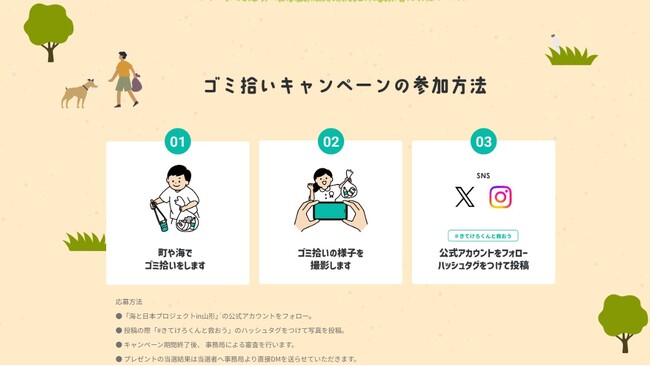 参加方法は”海と日本プロジェクトin山形”のSNS公式アカウント(公式X(旧Twitter)【https://twitter.com/yamagata_umi】、公式Instagram【https://www.instagram.com/umi_yamagata/】)をフォロー。ごみ拾いをした写真をX(旧Twitter)もしくはInstagramにてハッシュタグ「#きてけろくんと救おう」を付けて投稿!投稿者の中から抽選で海辺の宿泊券が抽選で当たります!1人何度でも、もちろん毎日でも投稿可能です。みんなでごみ拾いをして海を綺麗にしよう!詳細は公式サイトをご確認ください。