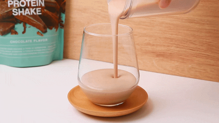 シェイカーに150~200mlの牛乳、豆乳または水を入れます。とろみ、濃さはお好みで調整してください。