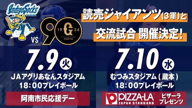 このたび、徳島インディゴソックス球団では、7月9日(火) JAアグリあなんスタジアム、7月10日(水) むつみスタジアムにて、NPB交流試合 読売ジャイアンツ三軍戦を開催することが決定しましたので、以下の通りお知らせいたします。