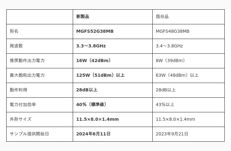 ・エピタキシャル成長層(※7)を改良したGaN HEMTの採用で、高効率動作と5Gの信号品質を満足する低歪特性を実現