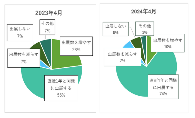今回の調査結果では、リアル展示会に対する今後の出展意向は「出展数を増やす」「直近1年と変わらず出展する」との回答を合わせると84%と、2023年4月の79%に比べ増加傾向にあります。