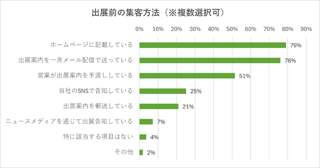 展示会(対面・オンライン含む)出展前の集客方法は「ホームページへの記載」が最も多く、79%となりました。また、「一斉メール配信」で出展案内を送っているとの回答も76%と多く、オンラインでの集客を行っている企業が多いことがわかります。