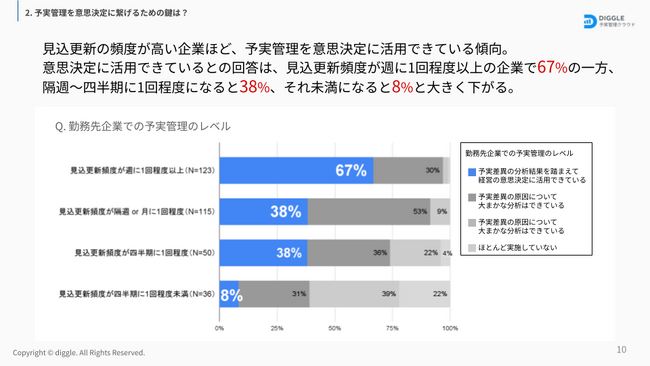 頻度の高い見込更新を行うことが経営の意思決定に貢献するために必要な一方で、見込更新頻度が高い企業ほど予実管理担当者の負荷が大きく、持続性に懸念があることが推察される結果となりました。