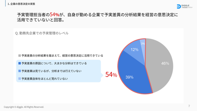 ・予実管理担当者の54%が、自身が勤める企業で予実差異の分析結果を経営の意思決定に活用できていないと回答。